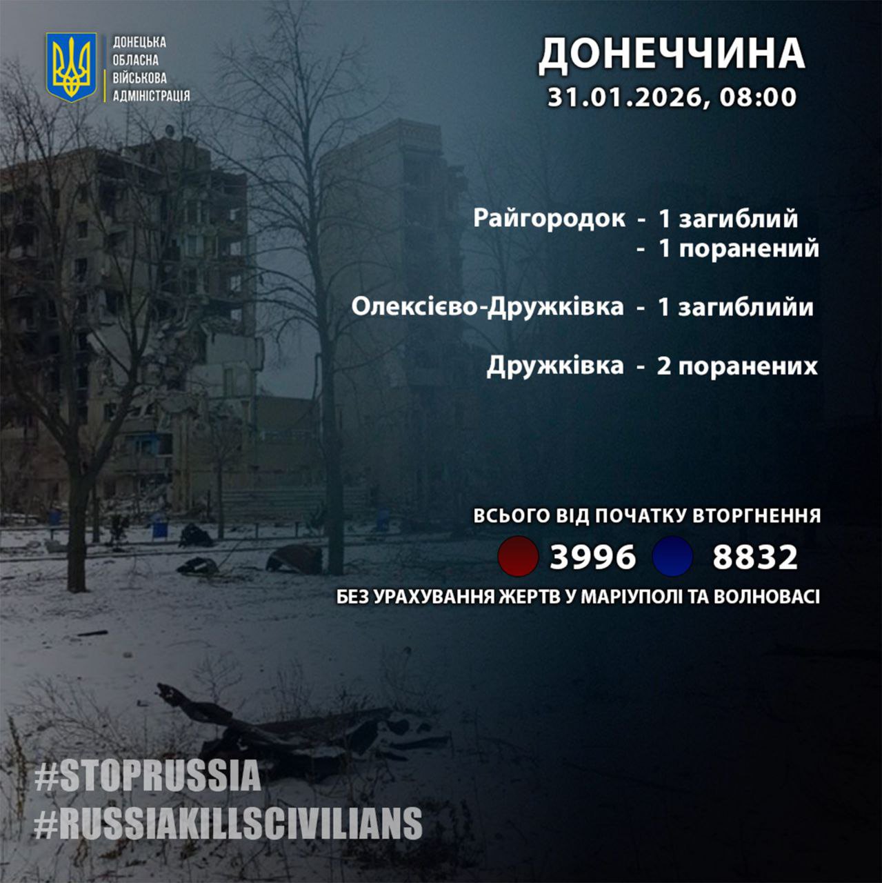 Загальна кількість жертв росіян на Донеччині складає 3996 убитих та 8832 постраждалих. Інформація подана без урахування Маріуполя та Волновахи.