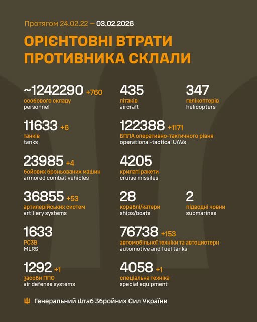 Загальні бойові втрати противника з 24.02.22 по 03.02.26 орієнтовно склали: