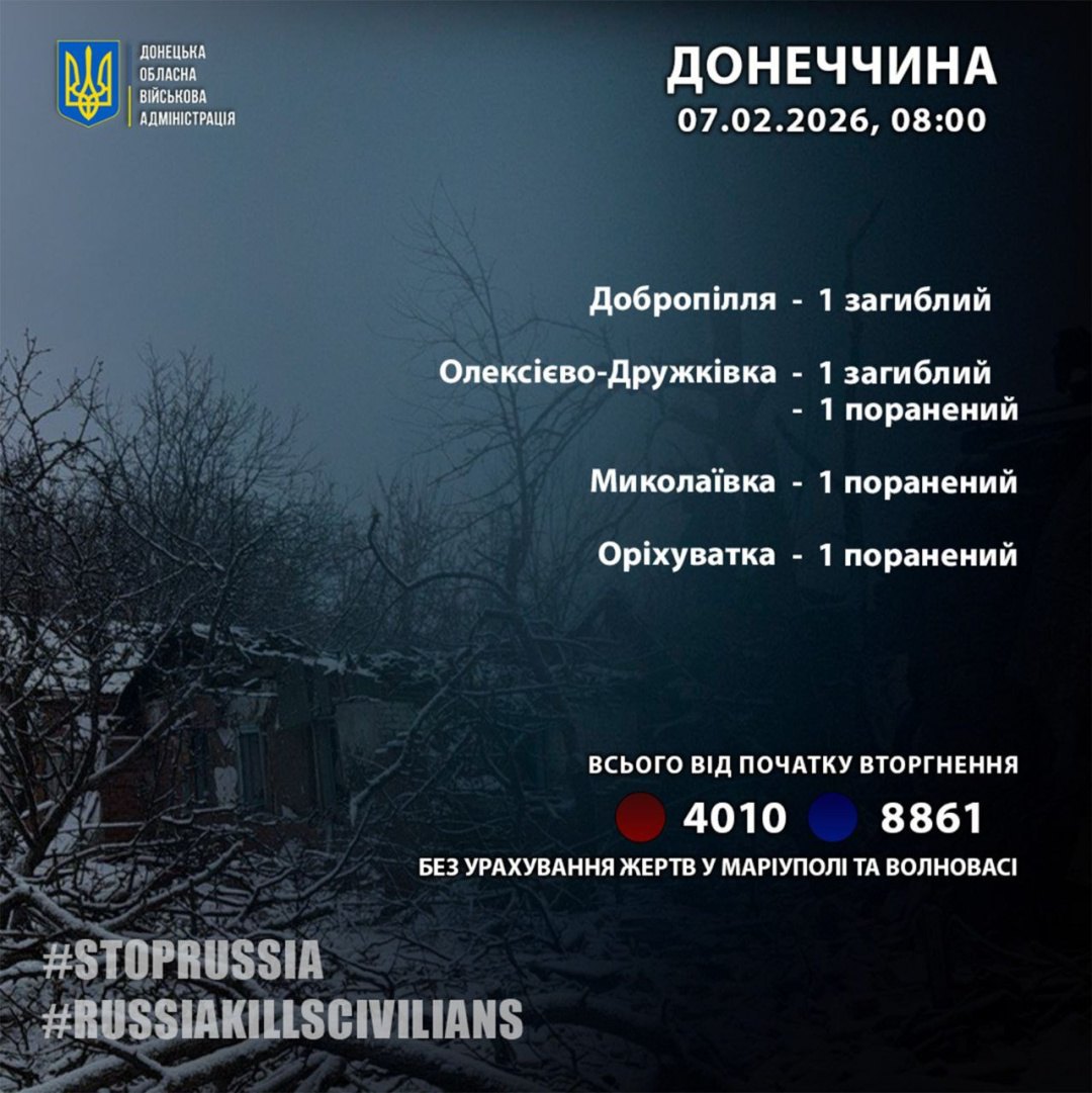 6 лютого росіяни вбили 2 жителів у Добропіллі та Олексієво-Дружківці. Ще три людини в області за добу дістали поранення.