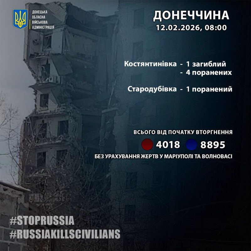 За минулу добу 11 лютого росіяни вбили жителя Костянтинівки Донецької області.