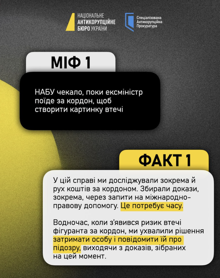 НАБУ тим часом опублікувало обґрунтування підозри. Зокрема, повідомило, що рішення про оголошення підозри ухвалили саме зараз, бо отримали дані про ризик втечі.