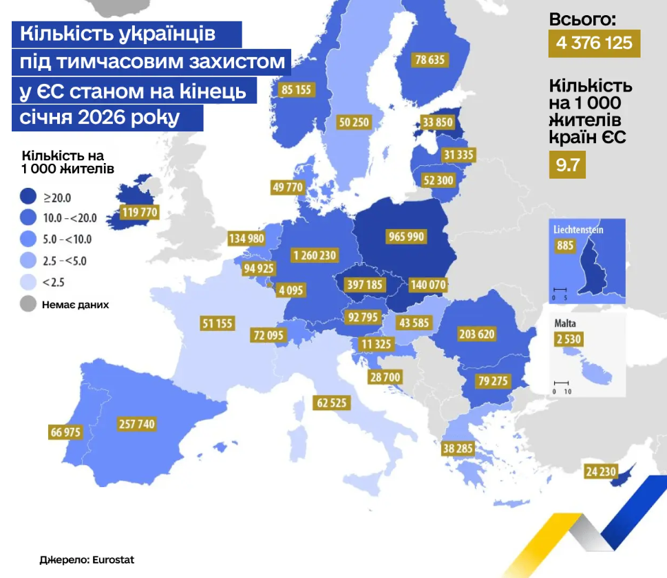 За даними Eurostat, протягом 2025 року країни ЄС ухвалили 683 395 нових рішень про надання тимчасового захисту громадянам України, що на 14% менше порівняно з 2024 роком. При цьому станом на кінець січня 2026 року кількість українців із таким статусом у ЄС зросла на 23 110 осіб порівняно з кінцем грудня 2025 року.