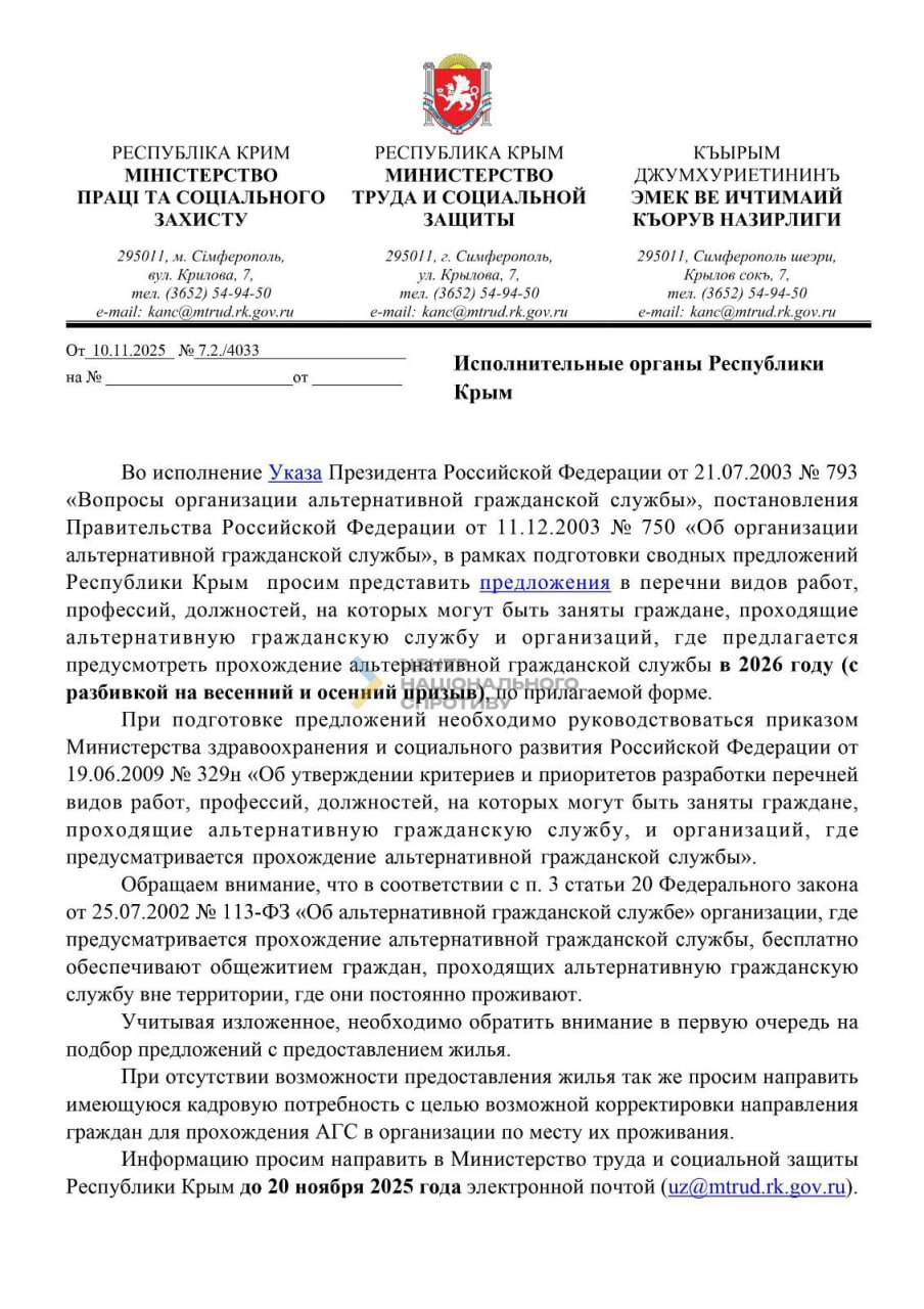 За інформацією спротиву, на півострові розгортають систему так званої "альтернативної цивільної служби". Вона передбачає залучення призовників до роботи на підприємствах та в установах, підконтрольних окупаційній владі.