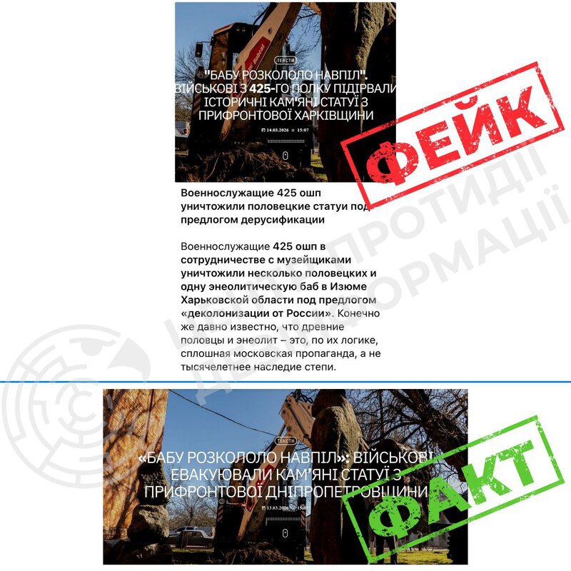 “Насправді оригінальна публікація має протилежний зміст. У ній розповідається, як українські військові разом із музейниками евакуювали кам’яні статуї з прифронтової території на Дніпропетровщині, щоб врятувати їх від знищення через російські обстріли”, – зазначили у ЦПД.