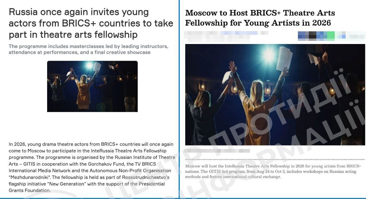 У Центрі протидії дезінформації попереджають про спроби російської пропаганди через театральну програму стажування для молодих акторів з країн блоку БРІКС.
