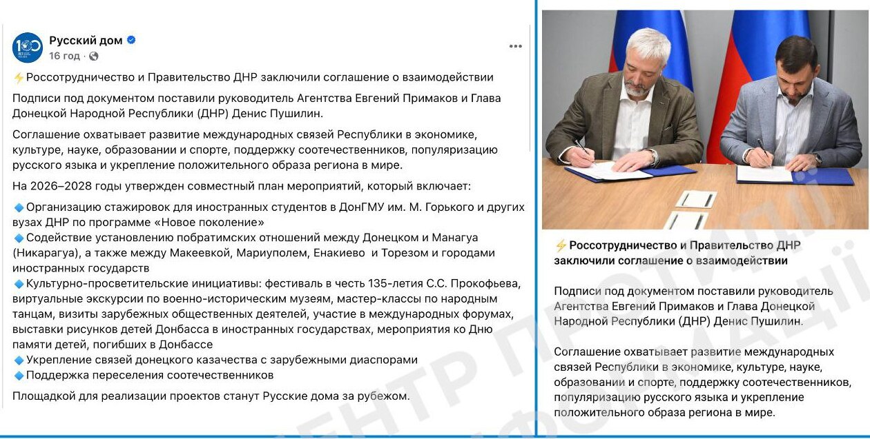 Як повідомили у Центрі протидії дезінформації, про це свідчить підписання угоди про співпрацю між “Россотруднічеством” та окупаційною адміністрацією на Донеччині.