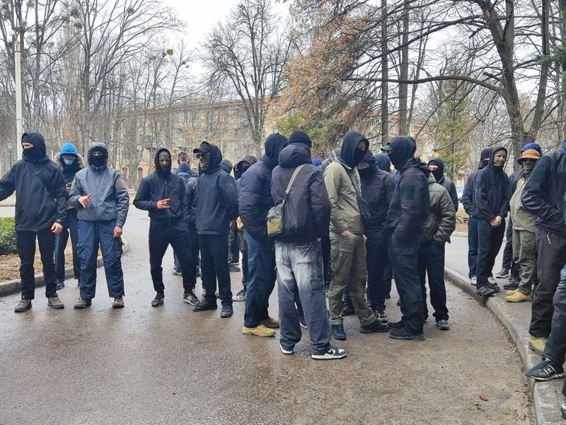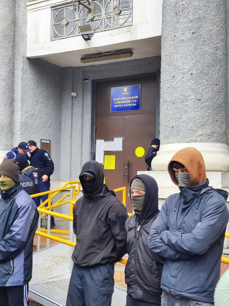 Тиск на суд чинили зокрема й молодики спортивного вигляду із закритими обличчями, що мітингували під харківським судом у цей день. Між собою вони спілкувалися російською, проте на камеру журналістів за командою вигукували гасла проти одностатевих шлюбів та так званої «деградації» — вже українською.