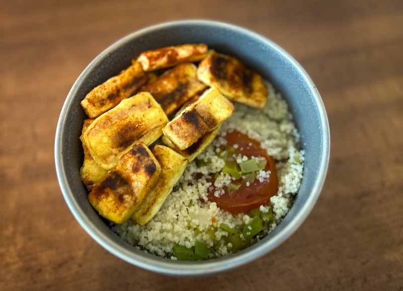 Насипте кускус у глибоку тарілку, додайте сіль за смаком та 1/3 чайної ложки сушеної мʼяти й залийте все окропом (можна також використовувати гарячий овочевий бульйон). Накрийте кришкою або іншою тарілкою та залиште на 10 хвилин. Поріжте тофу на шматки приблизно 2 сантиметри, посипте паприкою або іншими спеціями, котрі ви любите. Обсмажте на пательні або на грилі 5-7 хвилин. Так само обсмажте заморожені овочі. Змішайте готовий кускус з овочами і викладіть зверху обсмажений тофу. Можна також додати оливки, смажені печериці, консервовану кукурудзу.