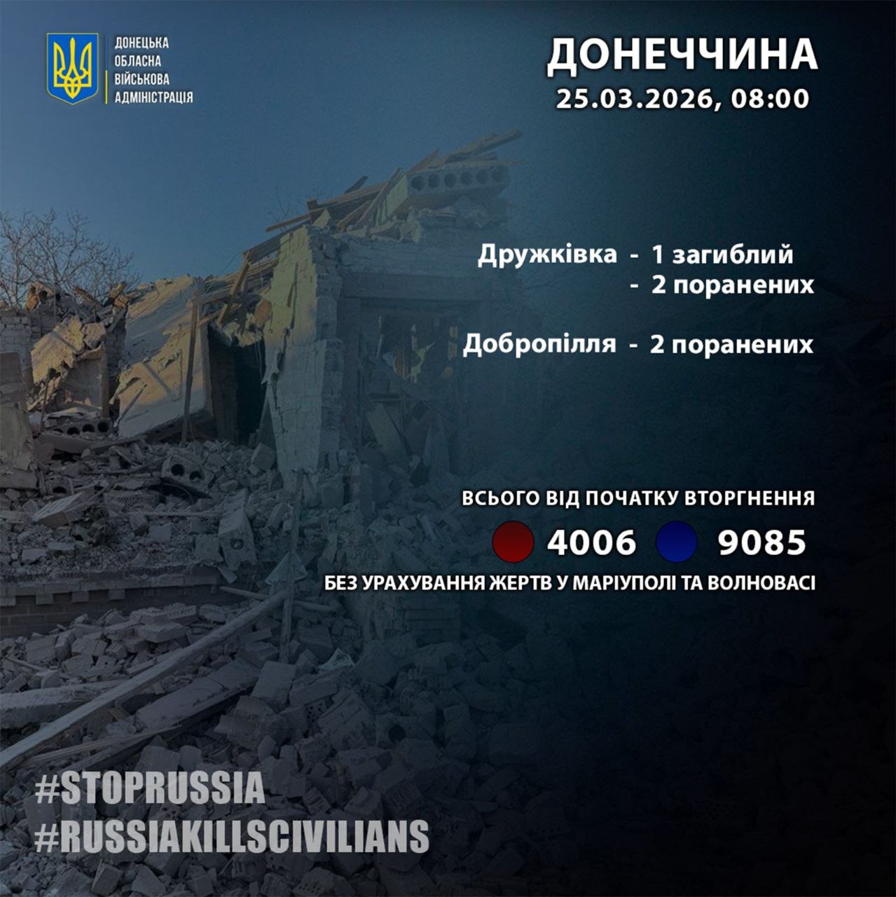 За минулу добу росіяни вбили одного мешканця Донецької області – у Дружківці.