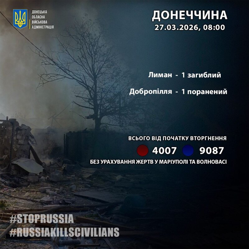 За минулу добу російська армія вбила у Донецькій області одну людину і поранила теж одну.