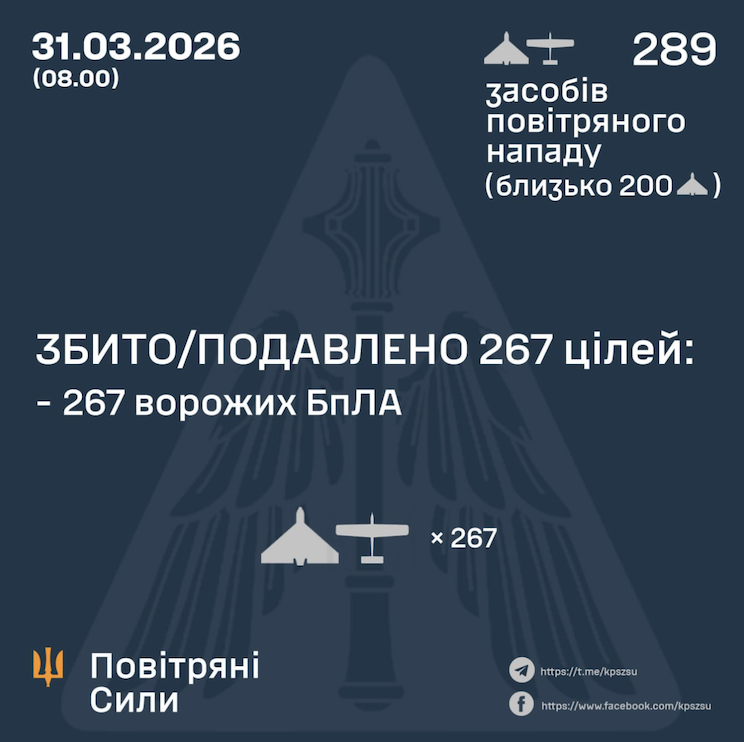 У ніч на 31 березня, починаючи з 18:00, Росія атакувала 289 ударними БпЛА типу Shahed, Гербера, Італмас та безпілотниками інших типів. Била з напрямків Орел, Курськ, Міллерово, Приморсько-Ахтарськ і окупованого Криму.