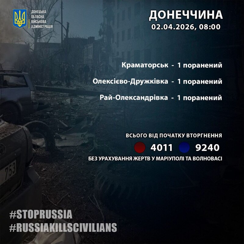 - З початку вторгнення окупанти вбили у регіоні 4011 людей і поранили 9240. Загальна кількість жертв росіян на Донеччині подана без урахування Маріуполя та Волновахи.