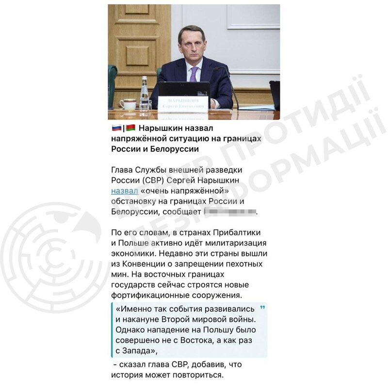 Очільник служби зовнішньої розвідки РФ Сергій Наришкін звинуватив країни Балтії і Польщу в “мілітаризації економіки”, натякаючи на “підготовку нападу на Росію”.