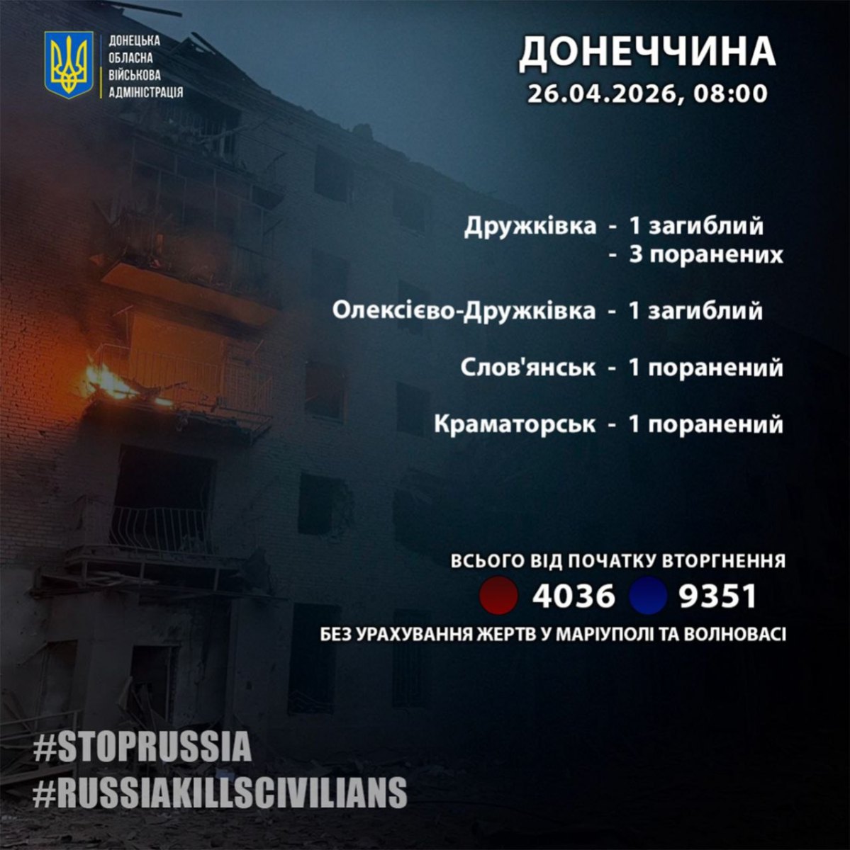 "За 25 квітня росіяни вбили 2 жителів Донеччини: у Дружківці та Олексієво-Дружківці. Ще 5 людей в області за добу дістали поранення", – ідеться у повідомленні.