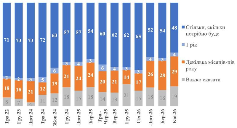 Негативна динаміка із зменшенням частки тих, хто готовий терпіти війну стільки, скільки буде необхідно, продовжується і в квітні. Якщо на початку березня таких було 54%, то на кінець квітня – 48%. Ще 4% готові терпіти 1 рік, тобто загалом 52% зараз говорять про умовно довгий період (у березні – 57%).