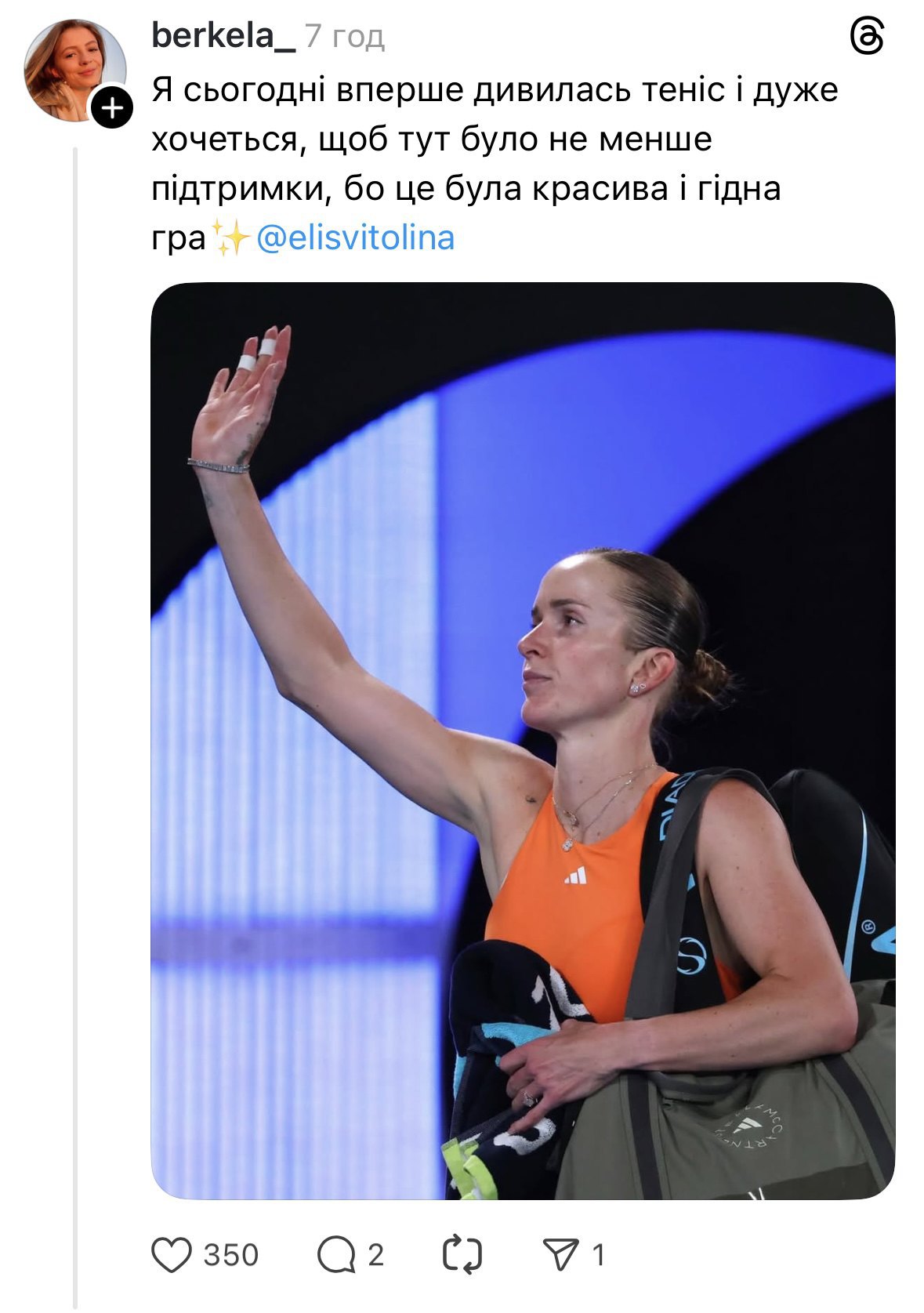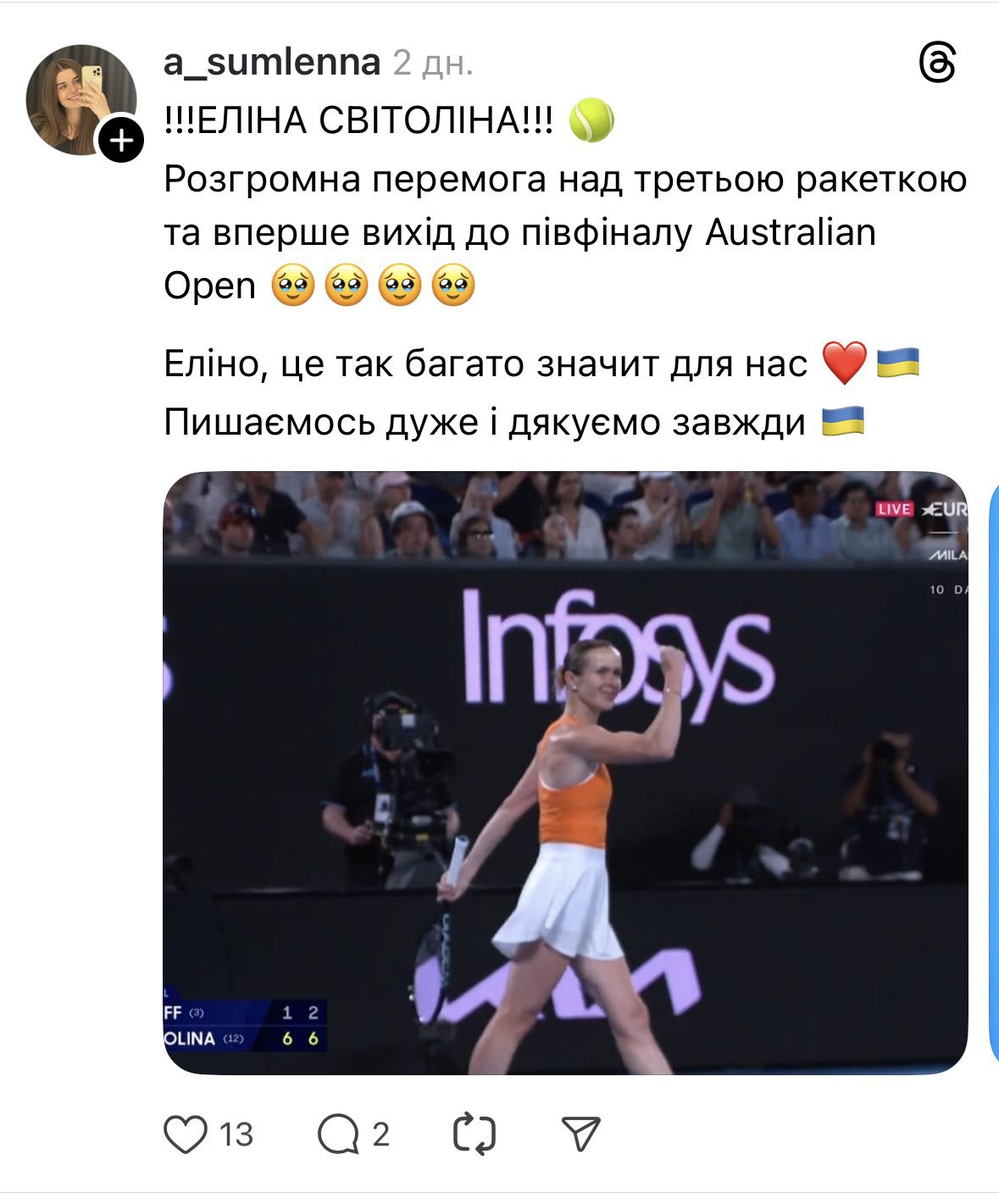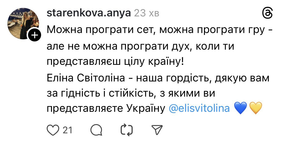 У мережі Threads люди буквально заспамили стрічку словами вдячності й підтримки Еліні. Дехто зізнавався, що до цьогорічного розіграшу AO не дивився жодного тенісного матчу. Згодом ті ж люди ставили будильники, щоб не пропустити матчі Світоліної в Австралії.