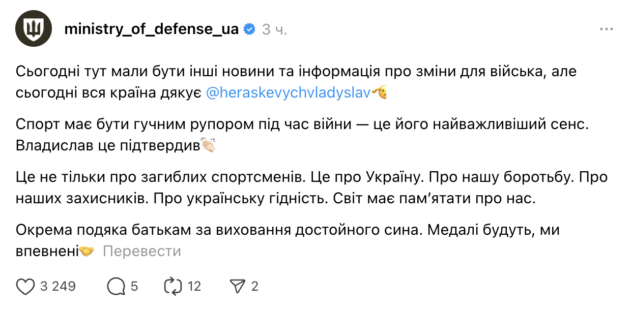 "Пам'ять про наших героїв – цінніша за будь-які медалі й правила. Владе, вся країна з тобою. Це був твій свідомий і принциповий вибір – ми його підтримуємо. Бо йдеться про пам'ять та шану до українських спортсменів, чиї життя забрала Росія!