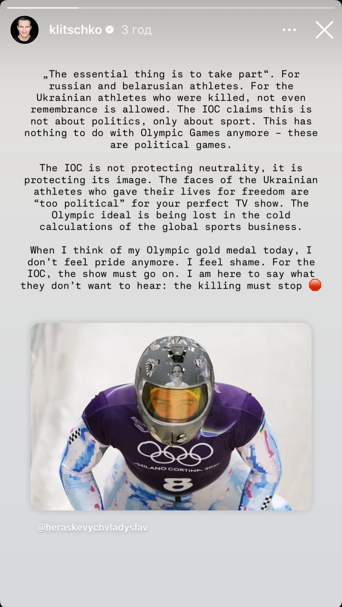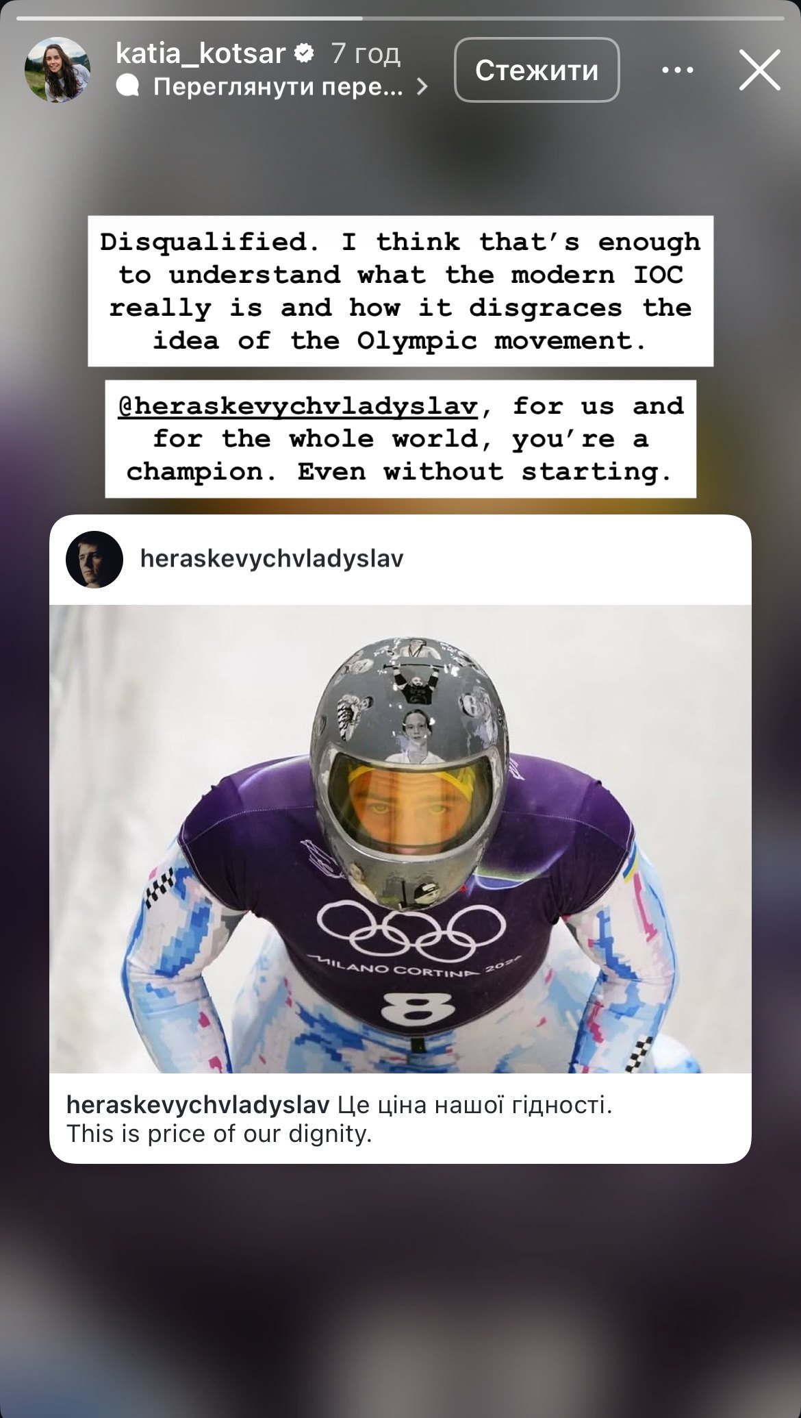 "Владиславе, ти вчинив гідно! Ми з тобою!» За версією МОК, рішення ухвалило журі Міжнародної федерації бобслею та скелетону (IBSF) через нібито невідповідність шолома правилам. Це рішення виглядає як помилка, яку не наважились виправити. Будемо виправляти цю помилку у правовому полі. Ця історія точно матиме продовження", – написав Матвій Бідний у Фейсбуці.