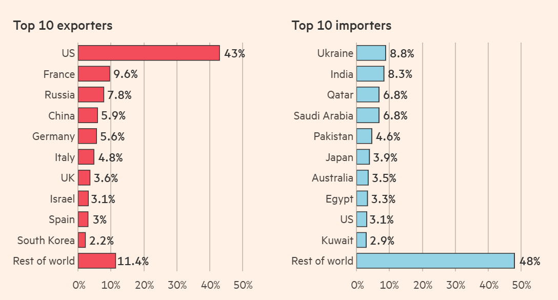 Яз зазначили дослідники, США знаходяться в унікальному становищі, коли йдеться про експорт зброї. Її частка у світовому експорті зброї становить 43%, що більш ніж у чотири рази перевищує частку наступного за величиною експортера Франції. США продовжують залишатися постачальником передових засобів для нанесення ударів на великі відстані, зокрема бойових літаків.
