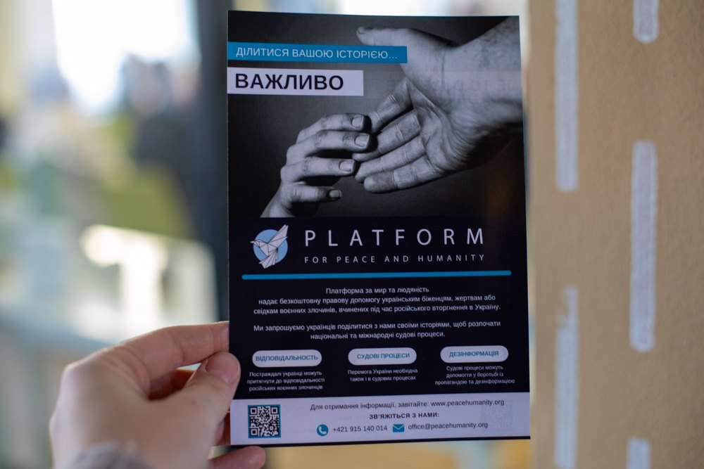 Чи не найскладніший у цьому процесі саме перший крок — знайти людей, що стали жертвами воєнних злочинів і готові дати свідчення. Нині Платформа за мир та людяність проводить низку зустрічей з представникам української громади, у тому числі онлайн, щоб розповісти про свою діяльність і так, можливо, спонукати людей, які були свідками або жертвами воєнних злочинів, говорити про це. Ці свідчення збирають у різних країнах і вносять у спільні бази даних, якими потім можуть користуватися правозахисники з будь-якої точки світу. Інколи, здавалося б, незначний епізод зі свідчень однієї людини стає важливим доказом чи доповнює картину у справі геть іншої жертви.