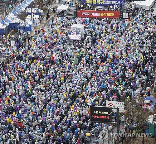 Тисячі консервативних груп організували мітинги в районі Гванхвамун у центрі Сеула ‒ через день після того, як вищий суд позбавив Юна влади, постановивши, що він порушив Конституцію, коли оголосив воєнний стан у грудні.