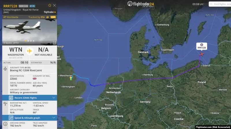 Один із літаків, Boeing RC-135V Rivet Joint, прибув із військового аеродрому Мілденхолл у Великій Британії.