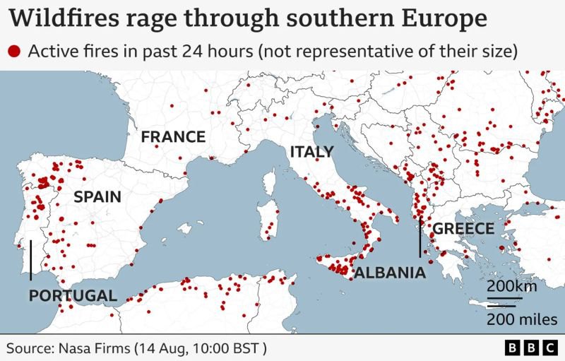 - Поряд з Іспанією, Греція, Болгарія, Чорногорія та Албанія також активували Механізм цивільного захисту ЄС через пожежі. Будь-яка країна, постраждала від стихійного лиха, в Європі та за її межами, може запросити екстрену допомогу через цей механізм.