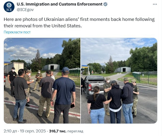 Імміграційна та митна служба США (ICE) оприлюднила фото депортованих громадян України у соцмережі X.