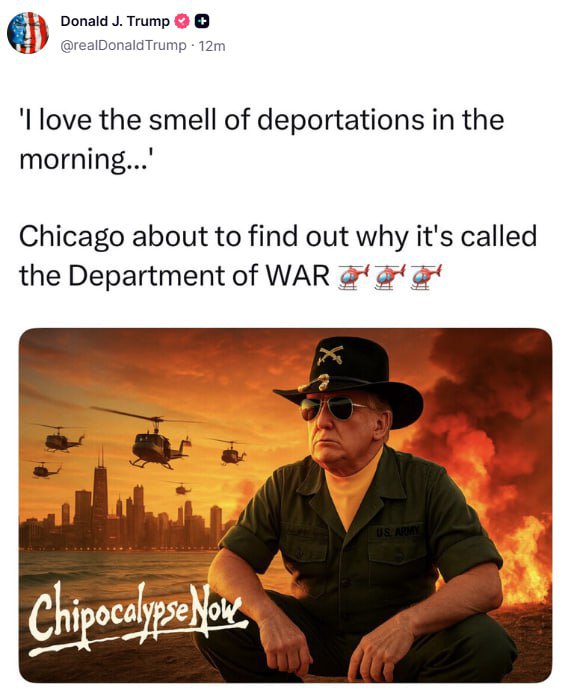 “Люблю запах депортацій зранку”. Чикаго скоро дізнається, чому у нас тепер є Міністерство війни”, – написав Трамп.