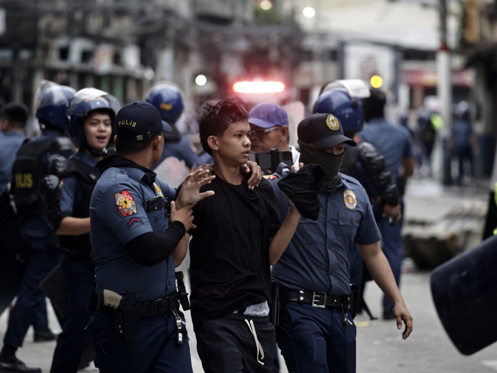Група протестувальників у чорних футболках, кидала каміння та пляшки в поліцейських, які забарикадували територію в Манілі біля президентського палацу. Поліцейські застосували сльозогінний газ та водяні шланги, щоб розігнати їх.