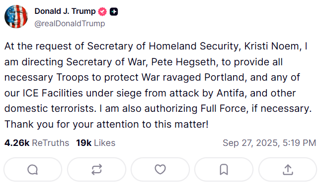 “На прохання міністра внутрішньої безпеки Крісті Ноем я доручаю міністру війни Піту Гегсету надати всі необхідні війська для захисту спустошеного війною Портленда та будь-яких наших об'єктів ICE [Міграційна служба США], що перебувають в облозі, від нападу Антифа та інших внутрішніх терористів. Я також уповноважую залучати силу на повну, якщо це необхідно. Дякую за вашу увагу до цього питання!” – написав президент.
