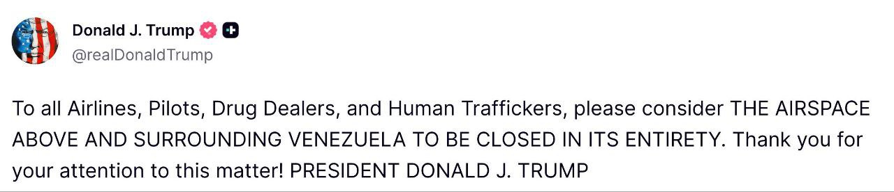 "Всім авіакомпаніям, пілотам, наркоторговцям та торговцям людьми, будь ласка, зверніть увагу, що повітряний простір над Венесуелою і навколо неї закритий. Дякую вам за увагу до цього питання!", – йдеться у його повідомленні.