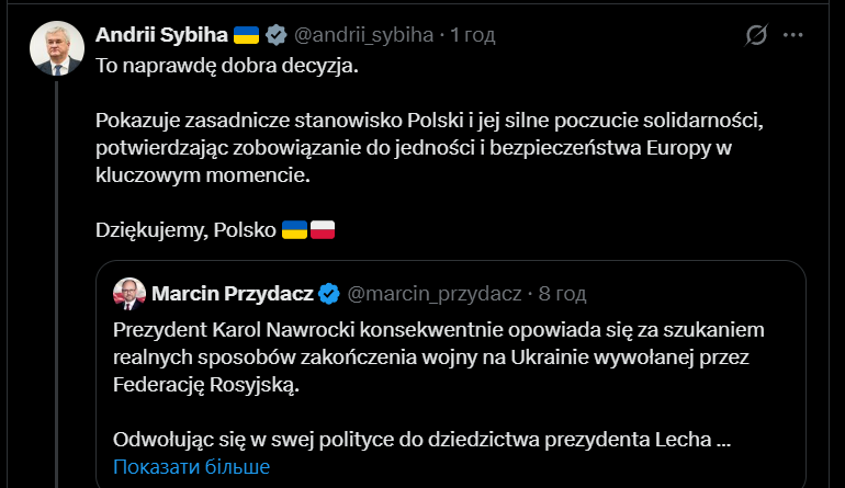 Міністр закордонних справ України Андрій Сибіга схвалив рішення президента Польщі Кароля Навроцького не зустрічатися з прем’єр-міністром Угорщини Віктором Орбаном.