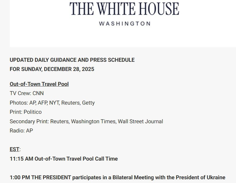 У Білому домі змінили розклад президента Трампа на 28 грудня. Зустріч із президентом України Володимиром Зеленським перенесли на 13:00 (20:00 за київським часом) у приватній резиденції лідера США в Мар-а-Лаго. Раніше вона була запланована на 15:00 (22:00 за київським часом).