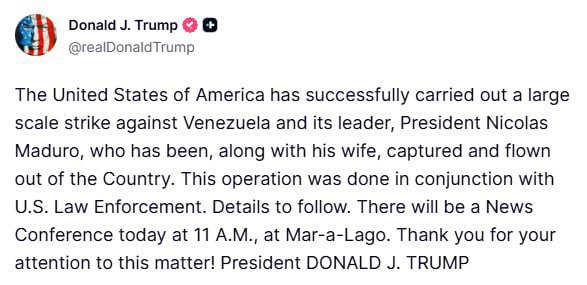 "США успішно здійснили масштабний удар по Венесуелі та її лідеру, президенту Мадуро, який разом зі своєю дружиною був захоплений і вивезений з країни", – написав Дональд Трамп.