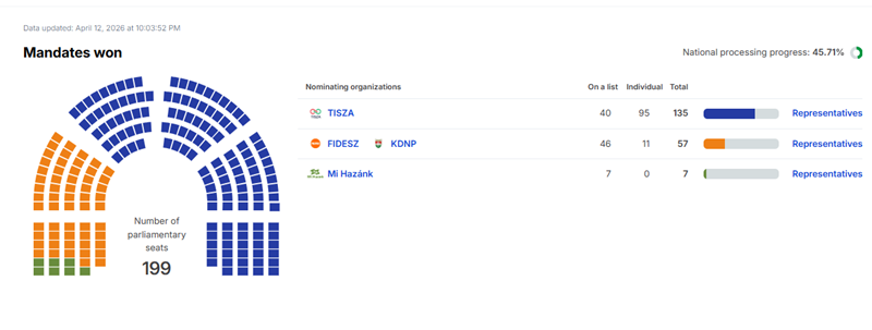 Національне виборче бюро Угорщини (NVI) продовжує публікувати результати парламентських виборів. Наразі опрацьовано 45,71% голосів.