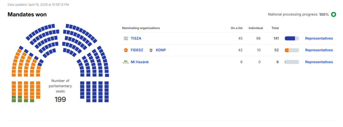 За результатами підрахунку 100% голосів, партія «Тиса» Петера Мадяра матиме 141 зі 199 місць у парламенті.
