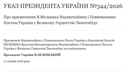 Президент України Володимир Зеленський призначив надзвичайного і повноважного посла України в Королівстві Бельгія Ярослава Мельника надзвичайним і повноважним послом України у Великому Герцогстві Люксембург за сумісництвом.
